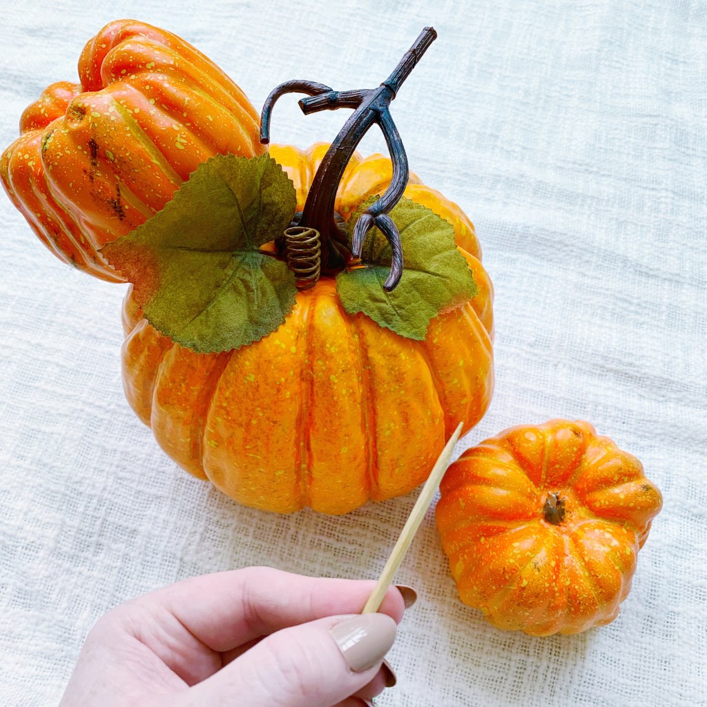 - Some skinny wood skewers – (optional). You could just use hot glue only, however this gives your pumpkin a lot more sturdiness! This way, you can pack it away and bring it back as decor for many years to come!