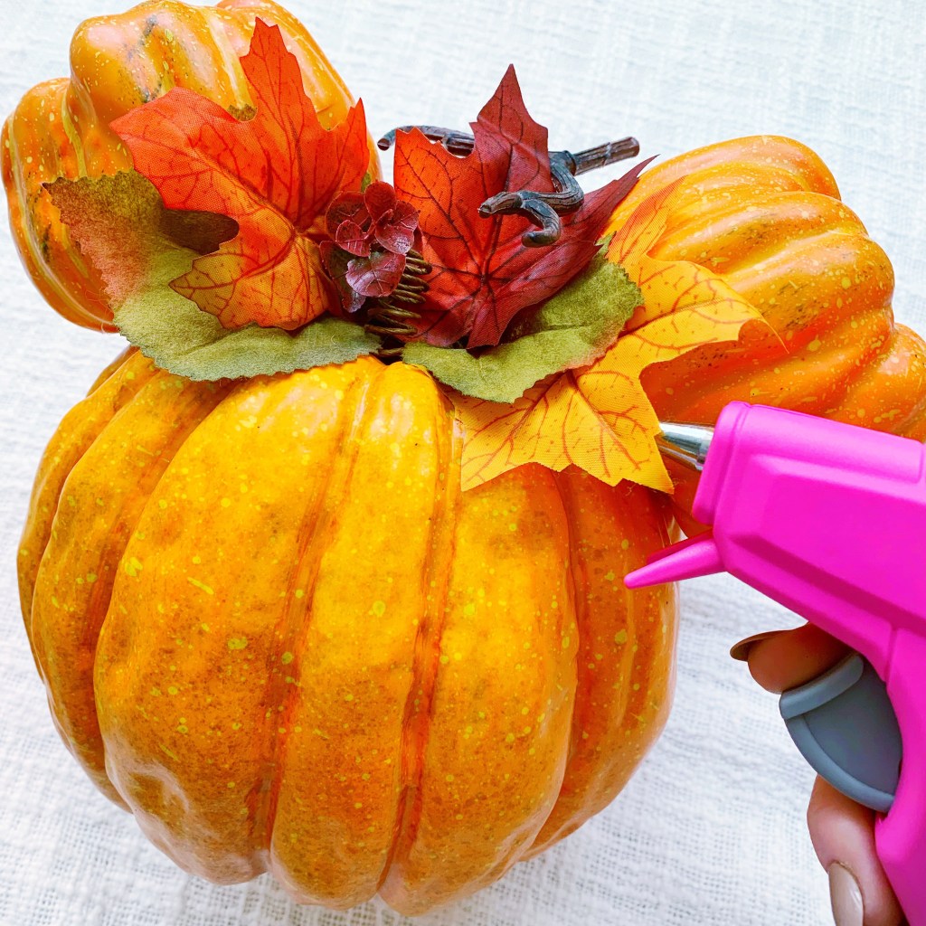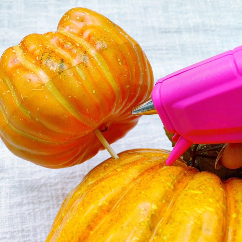You’re just going to put some hot glue around the bottom of the small pumpkin with the skewer and now push the ear down into the large pumpkin. It should feel pretty locked into place!